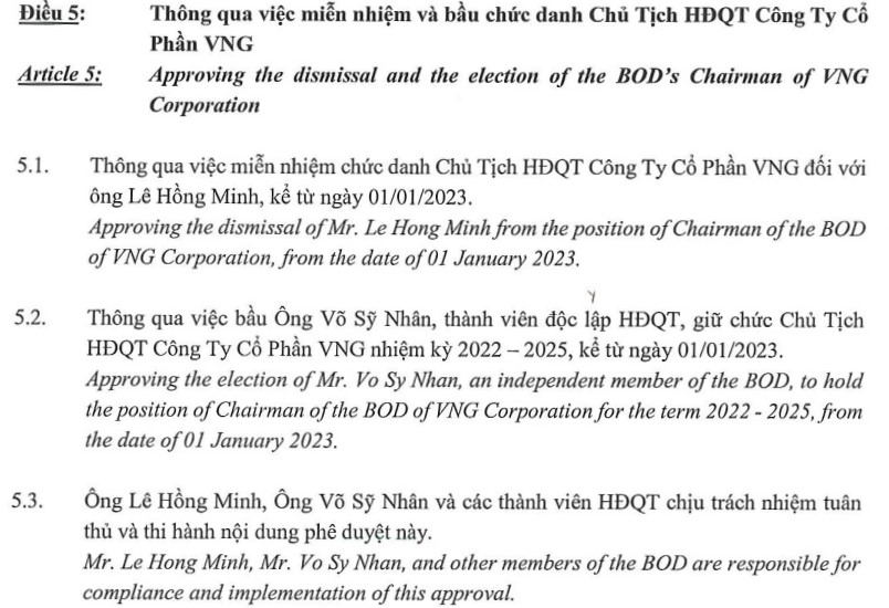 Ngày 10/01, Công ty cổ phần VNG (UPCoM: VNZ) công bố thông tin về việc miễn nhiệm chức danh Chủ tịch HĐQT đối với ông Lê Hồng Minh – đồng sáng lập VNG từ ngày 1/1/2023.