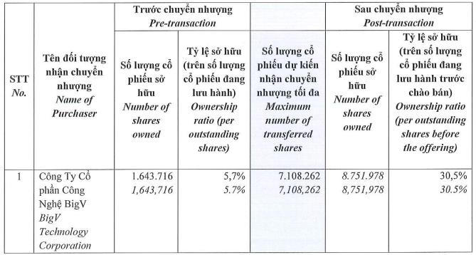 Trong tờ trình cổ đông, VNG công bố danh sách duy nhất 1 nhà đầu tư chứng khoán chuyên nghiệp dự kiến nhận chuyển nhượng là CTCP Công nghệ BigV. Hiện BigV sở hữu 1, 6 triệu cổ phiếu, tương đương tỷ lệ 5,7% vốn VNG. Nếu mua toàn bộ số cổ phần tại VNG, BigV sẽ nâng sở hữu lên 8,75 triệu cổ phần, tương đương tỷ lệ 30,5%.
