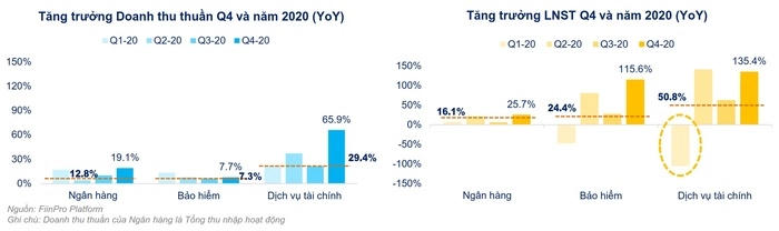 Trong khi lợi nhuận khối Phi tài chính suy giảm mạnh, các ngành thuộc khối Tài chính đều ghi nhận doanh thu và lợi nhuận cùng tăng trưởng tốt trong quý IV cũng như cả năm 2020.