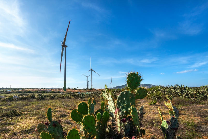 Những đàn bò, đàn dê thong dong gặm cỏ dưới chân những trụ quạt gió quay đều là điểm nhấn cho khung cảnh ấn tượng ở cánh đồng điện gió Mũi Dinh. Cùng với đó dưới chân của những “chiếc cối xay gió” khổng lồ là bạt ngàn sắc hoa xương rồng, tạo nên một khung cảnh nên thơ, không dễ tìm thấy được ở bất cứ đâu trên mảnh đất hình chữ S.