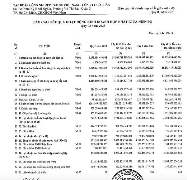 Về kết quả kinh doanh, quý III/2023, Tập đoàn Công nghiệp Cao su Việt Nam ghi nhận doanh thu đạt 6.199,5 tỷ đồng, tăng 5,9% so với cùng kỳ năm ngoái.