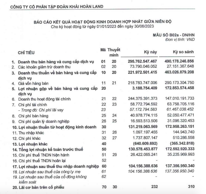 Theo báo cáo kết quả hoạt động kinh doanh hợp nhất giữa niên độ đã được soát xét, Khải Hoàn Land ghi nhận doanh thu thuần nửa đầu năm 2023 đạt 221,9 tỷ đồng, giảm 52% so với cùng kỳ năm ngoái.