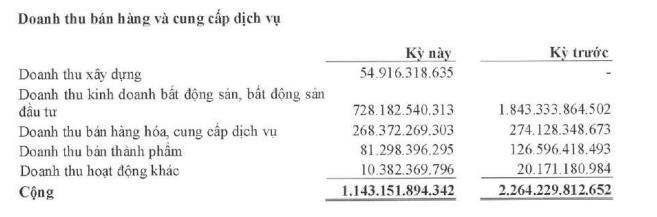 Trong cơ cấu doanh thu, khoản doanh thu từ kinh doanh bất động sản, bất động sản đầu tư giảm mạnh 61% so với cùng kỳ, chỉ đạt hơn 728 tỷ đồng.