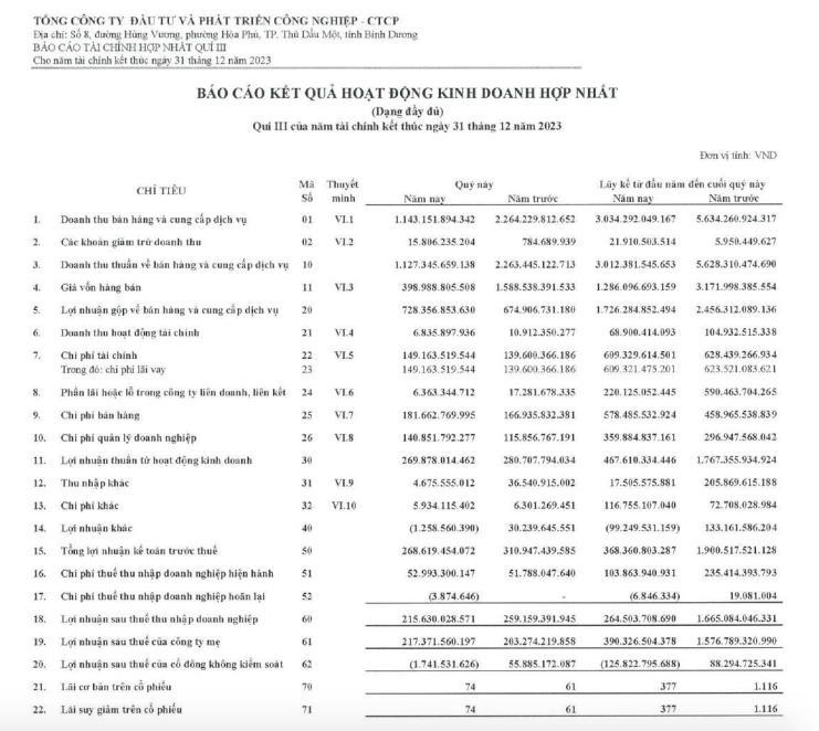 Tính chung 9 tháng đầu năm, Becamex IDC đạt hơn 3.012 tỷ đồng doanh thu thuần và 264,5 tỷ đồng lợi nhuận sau thuế, giảm lần lượt 46% và 84% so với cùng kỳ năm ngoái.
