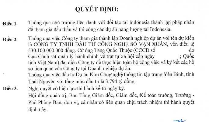 Đồng thời, thông qua góp vốn thành lập Công ty TNHH Đầu tư Công nghệ Số Vạn Xuân, vốn điều lệ hơn 530 tỷ đồng, nhằm triển khai dự án khu công nghệ thông tin tập trung Yên Bình tại tỉnh Thái Nguyên, diện tích gần 198ha, tổng mức đầu tư 3,794 tỷ đồng.