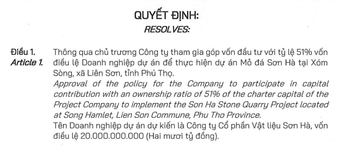 Pháp nhân mới dự kiến mang tên CTCP Vật liệu Sơn Hà, có vốn điều lệ 20 tỷ đồng.
