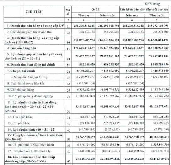 Kết quả, doanh nghiệp ghi nhận lợi nhuận kế toán trước thuế đạt 33,5 tỷ đồng giảm 16,44% so với cùng kỳ. Lợi nhuận sau thuế ghi nhận 25,4 tỷ đồng giảm 21,49% so với thực hiện cùng kỳ năm trước.