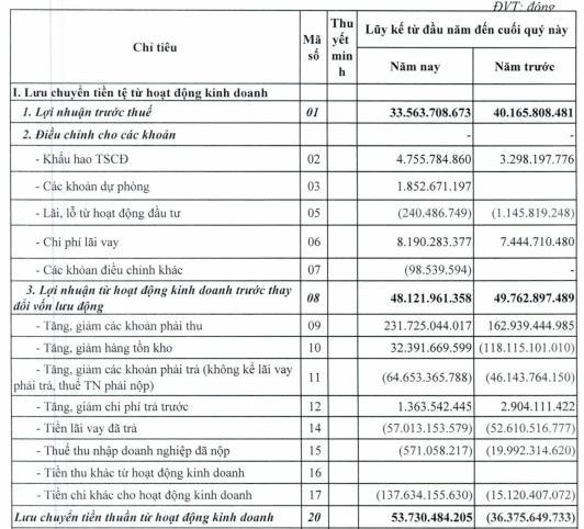 Về dòng tiền của doanh nghiệp, lưu chuyển tiền thuần từ hoạt động kinh doanh ghi nhận dương 53,7 tỷ trong khi cùng kỳ năm ngoái đang ghi nhận âm 36 tỷ đồng.