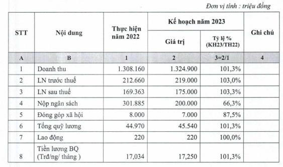Lợi nhuận trước thuế đạt 219 tỷ đồng tăng 3% so với thực hiện năm 2022. Lợi nhuận sau thuế đạt 175 tỷ đồng, tăng 3,3% so với thực hiện năm 2022. Đồng thời đóng góp vào ngân sách nhà nước 200 tỷ đồng.