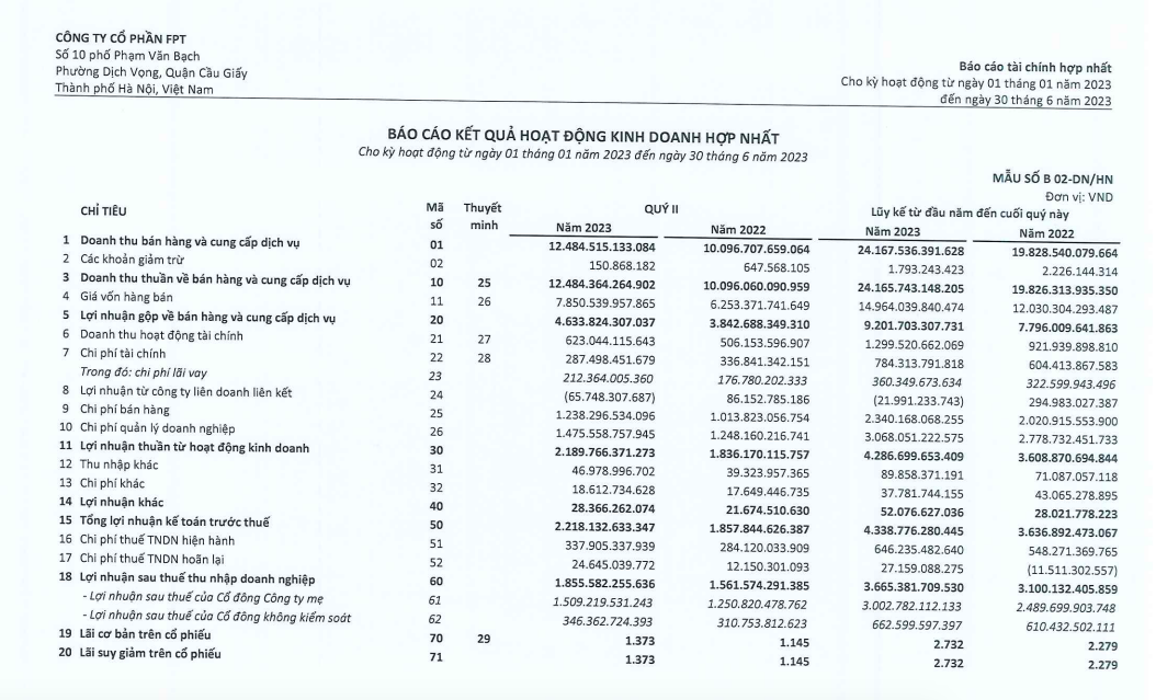 Cụ thể, trong quý II/2023, doanh nghiệp FPT ghi nhận doanh thu thuần đạt 12.484 tỷ đồng, tăng 23,6% so với cùng kỳ.