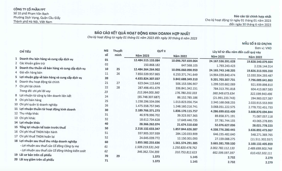 Lũy kế 6 tháng đầu năm, FPT ghi nhận doanh thu thuần đạt 24.165 tỷ đồng, tăng 21,6% so với cùng kỳ năm ngoái. Lợi nhuận sau thuế đạt 3.665 tỷ đồng, tăng 18,2% so với nửa đầu năm 2022.