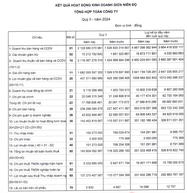 Trong kỳ, công ty ghi nhận doanh thu thuần đạt 2.119 đồng, tăng 39% so với cùng kỳ.