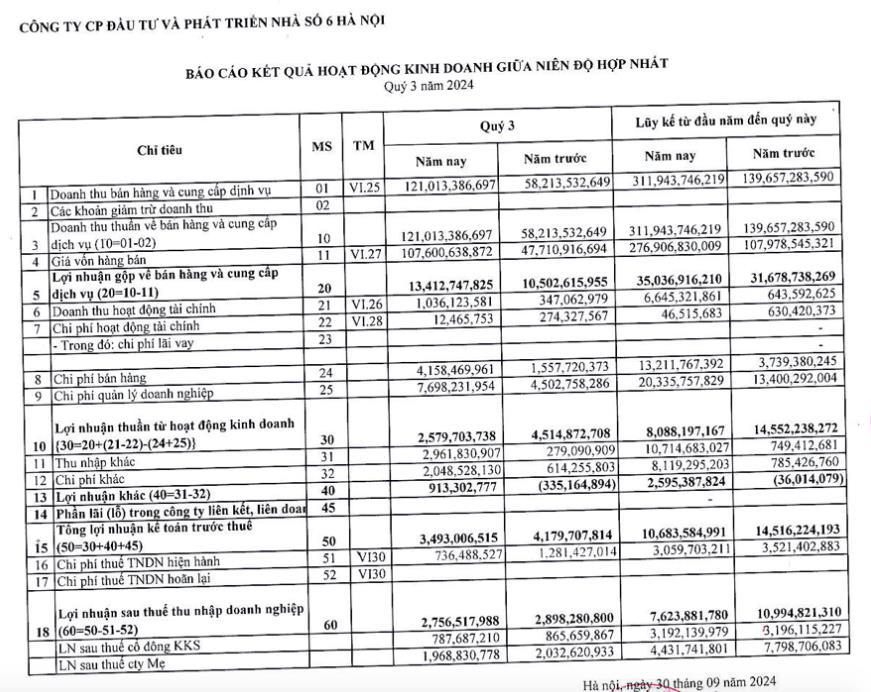 Về bức tranh tài chính, theo báo cáo kinh doanh hợp nhất quý III/2024, Handico 6 ghi nhận doanh thu thuần đạt 121 tỷ đồng, tăng gấp 2 lần so với cùng kỳ năm ngoái, chủ yếu từ hoạt động bất động sản và xây lắp.