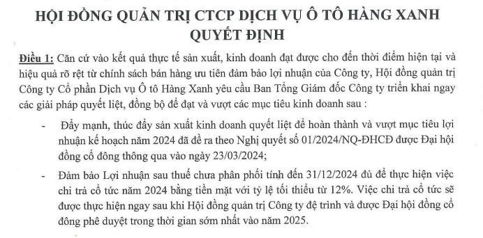 Hội đồng quản trị Công ty cổ phần Dịch vụ Ô tô Hàng Xanh (Haxaco, mã ck: HAX) vừa thông qua việc thúc đẩy sản xuất kinh doanh để hoàn thành mục tiêu lợi nhuận năm 2024 và đảm bảo thực hiện việc chi trả cổ tức năm 2024 bằng tiền mặt.