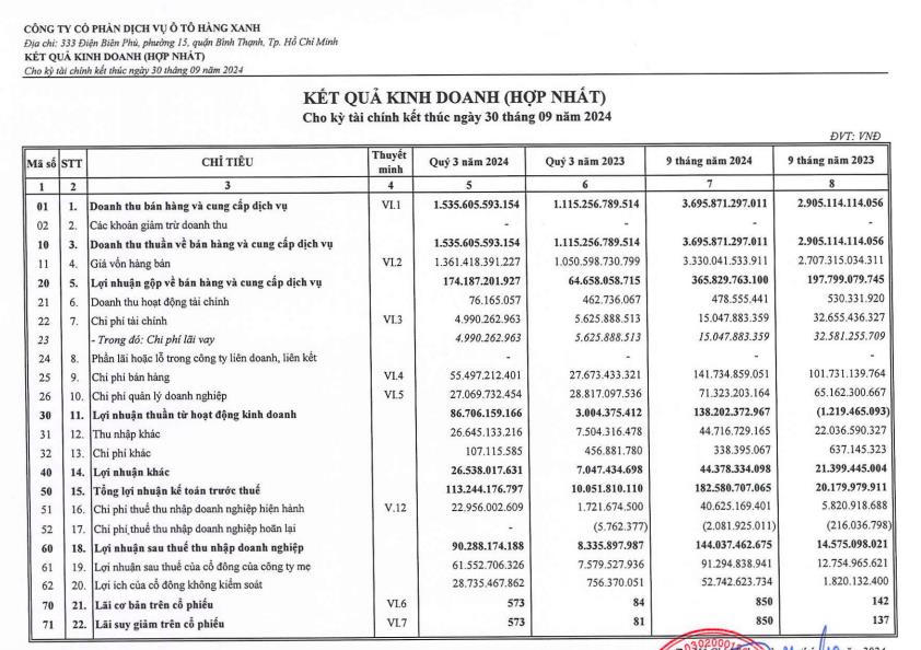 Về bức tranh tài chính, trong quý III/2024, Haxaco ghi nhận doanh thu thuần đạt hơn 1.535 tỷ đồng, tăng 38% so với cùng kỳ, khả quan nhất gần hai năm trở lại.