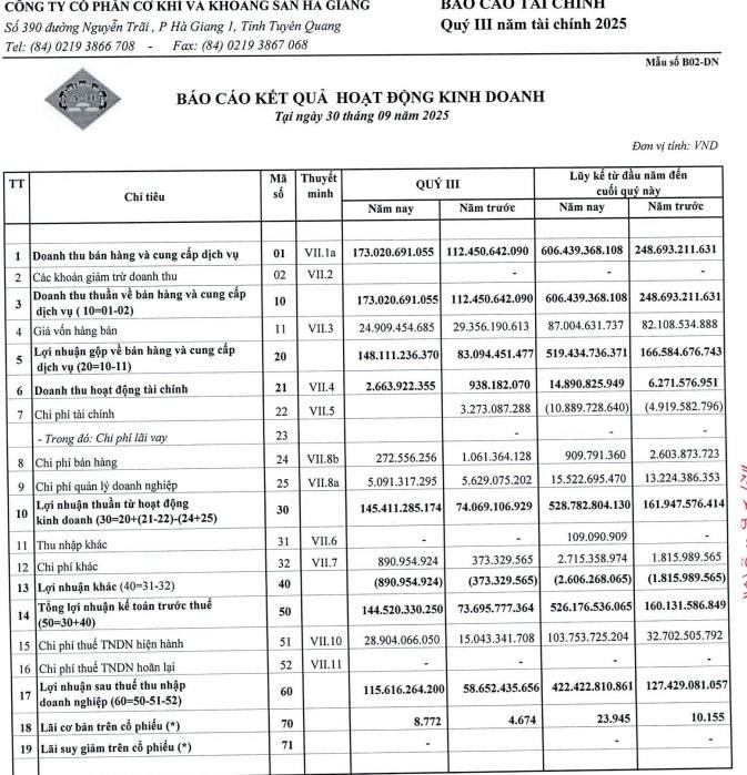Lãi quý III/2025 tăng bằng lần, Cơ khí và Khoáng sản Hà Giang (HGM) dự chi hơn 100 tỷ đồng trả cổ tức