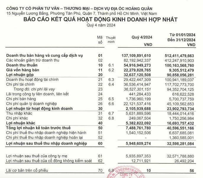 Tính chung cả năm 2024, HQC ghi nhận doanh thu thuần đạt 100,1 tỷ đồng; lợi nhuận sau thuế đạt 32,5 tỷ đồng.