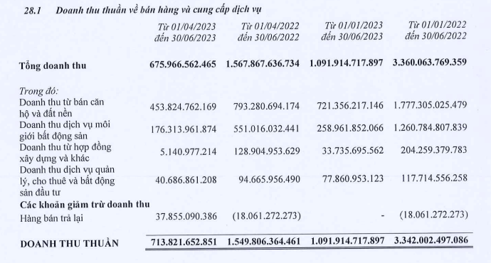 Theo bản thuyết minh, doanh thu chính đến từ bán căn hộ và đất nền với 453,8 tỷ đồng; tiếp đến là dịch vụ môi giới bất động sản 176,3 tỷ đồng và dịch vụ quản lý, cho thuê, bất động sản đầu tư 40,6 tỷ đồng.