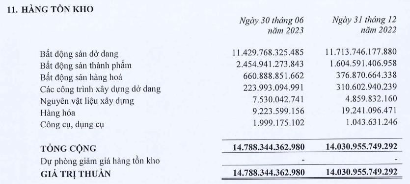 Đáng chú ý, giá trị hàng tồn kho tăng 5% so với hồi đầu năm, ở mức 14.788 tỷ đồng. Trong đó, phần lớn là bất động sản dở dang với 11.430 tỷ đồng, tiếp đến là bất động sản thành phẩm ở 2.455 tỷ đồng; bất động sản hàng hóa là 660,8 tỷ đồng.
