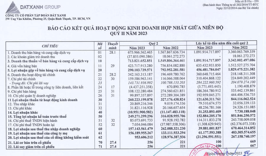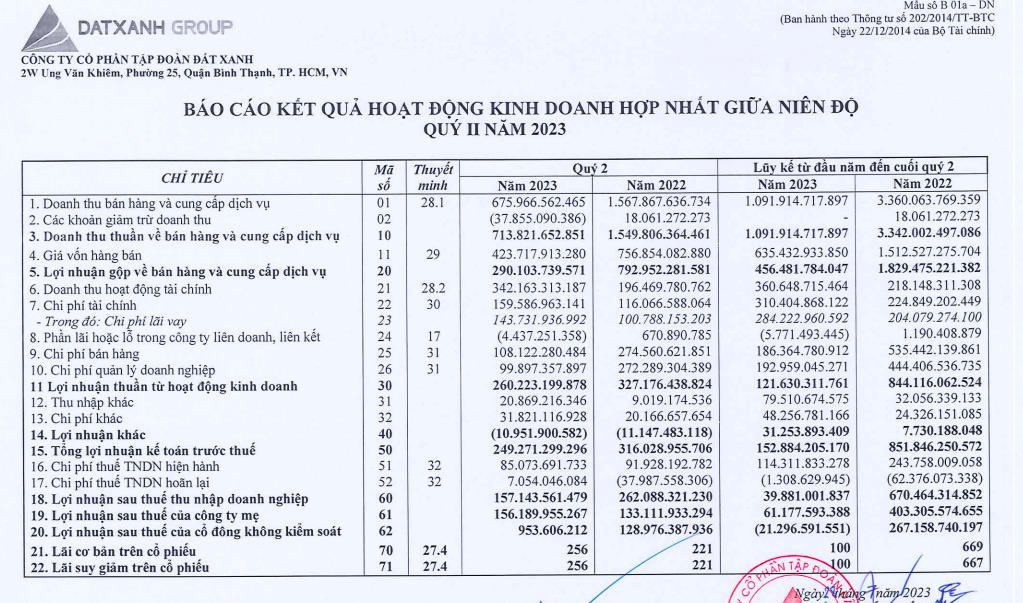 Công ty cổ phần Tập đoàn Đất Xanh (mã ck: DXG) vừa công bố báo cáo tài chính hợp nhất quý II/2023 và lũy kế 6 tháng đầu năm.