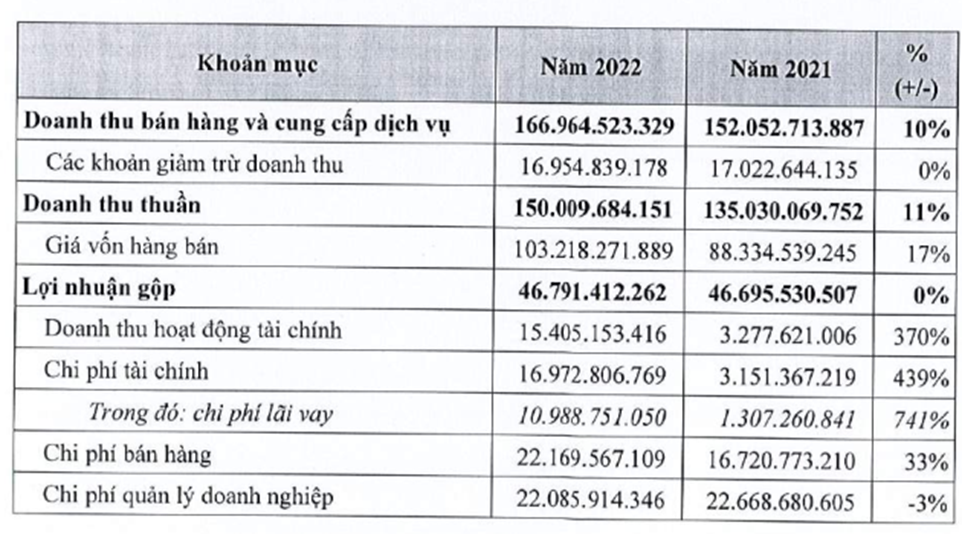 Tìm hiểu thêm về cơ cấu doanh thu chi phí 2022, đơn vị có khoản đột biến từ doanh thu tài chính ghi nhận 15,4 tỷ tăng 4,7 lần so với cùng kỳ năm trước. Tuy nhiên, chi phí tài chính cũng có mức gia tăng lớn gấp 5,45 lần lên mức 16,9 tỷ trong năm 2022, trong đó chi phí lãi vay chiếm gần 11 tỷ đồng.