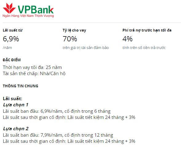 Theo Gobear - nền tảng dịch vụ tài chính được thành lập năm 2014 và có mặt tại 7 quốc gia Singapore, Thái Lan, Việt Nam, Malaysia, Philippines, Indonesia, Hong Kong - VPBank là ngân hàng có lãi suất cho vay mua nhà khởi điểm thấp nhất trong số ngân hàng Việt Nam, từ 6,9%/năm.