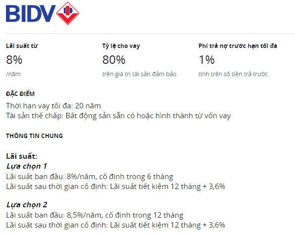 BIDV để lãi suất khởi điểm ban đầu là 8%/năm trong cố định 6 tháng. Lãi suất sau thời gian cố định cao hơn 3,6% so với lãi suất tiết kiệm 12 tháng. Người vay có thể lựa chọn trả lãi suất ban dầu 8,5%/năm trong 12 tháng và sau đó trả lãi suất tương đương trường hợp đầu tiên. Thời hạn vay tối đa là 20 năm với giá trị bằng 80% tài sản đảm bảo.