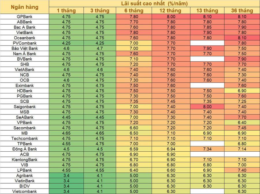 Hiện mức lãi suất cao nhất được áp dụng cho kỳ hạn này là 8% do GPBank niêm yết theo hình thức gửi tiền trực tuyến.
