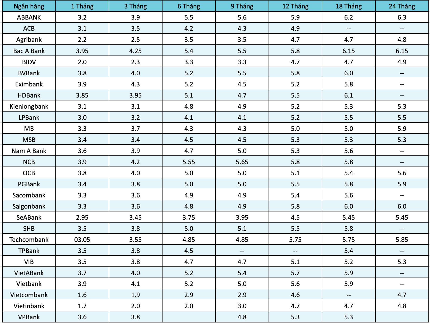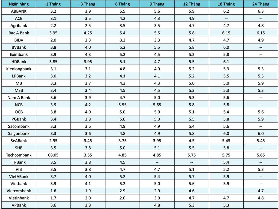 Đối với tiền gửi kỳ hạn 18 tháng, lãi suất cao nhất hiện nay là 6,2%/năm được áp dụng tại An Bình Bank; BacABank, HDBank thấp hơn không đáng kể khi lần lượt trả lãi 6,15 và 6,1%/năm với tiền gửi kỳ hạn 18 tháng. Lãi suất tiết kiệm 24 tháng nhìn chung đi ngang so với kỳ hạn 18 tháng.