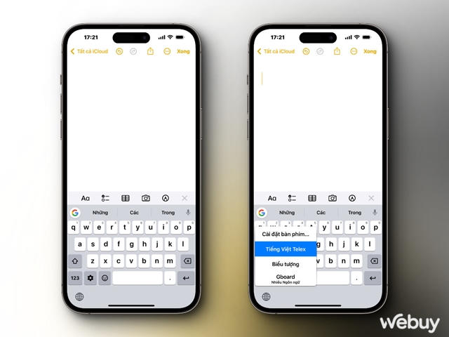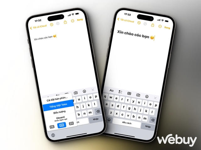 Để chuyển bàn phím, bạn hãy mở một ứng dụng soạn thảo nào đó như Ghi chú, sau đó nhấn và giữ vào biểu tượng hình quả địa cầu. Khi đó menu lựa chọn bàn phím hiện ra, bạn hãy nhấn vào "Tiếng Việt".