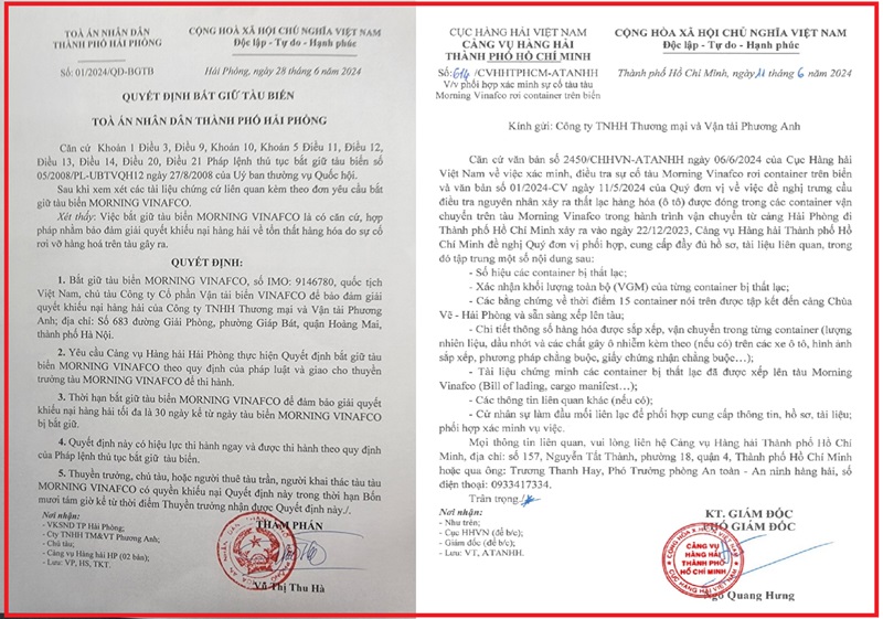 Ngày 28/6, TAND TP Hải Phòng ra Quyết định số 01/2024/QĐ-BGTB yêu cầu Cảng vụ Hải Phòng thực hiện quyết định bắt giữ tàu biển tên Morning Vinafco (số hiệu IMO 9146780, quốc tịch Việt Nam, chủ tàu là Công ty cổ phần Vận tải biển Vinafco).