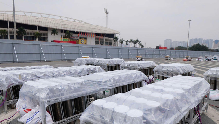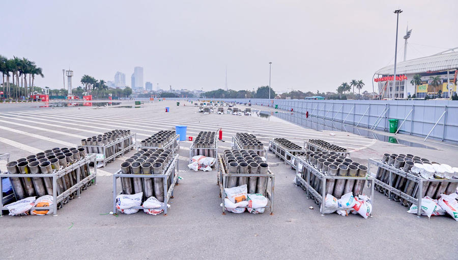 Từ rất sớm, “trận địa pháo hoa” đã sẵn sàng. Hơn 950 giàn phun, 4.400 ống pháo hỏa thuật được lắp đặt trên mái và hai bên khán đài, cùng 4.600 pháo hoa nổ tầm cao bố trí vòng ngoài sân vận động, tạo nên một cấu trúc ánh sáng bao trùm Mỹ Đình, sẵn sàng bùng nổ chiêu đãi người dân Thủ Đô.