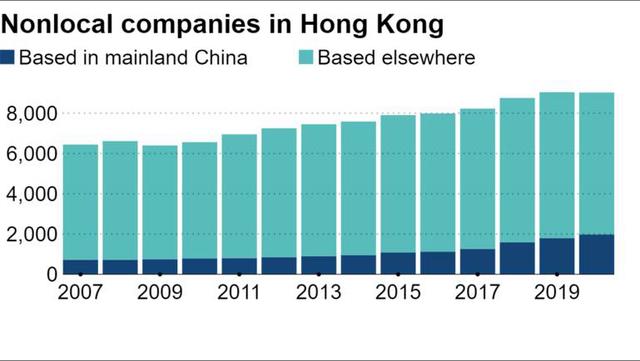 Doanh nghiệp Trung Quốc đại lục chiếm phần lớn nhất trong số các công ty quốc tế vẫn trụ lại Hong Kong, và tăng 10,4% lên 1.986 công ty, theo dữ liệu của chính thức. Tuy nhiên, mức tăng này không thể bù đắp cho sự sụt giảm của các công ty Nhật Bản, Mỹ và Anh. Số lượng công ty Nhật Bản, Mỹ và Anh vẫn đặt trụ sở hoặc văn phòng ở Hong Kong lần lượt là 1.398, 1.283 và 665.