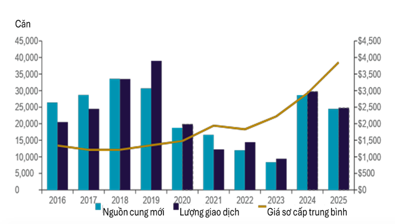 Phân khúc nhà liền thổ có diễn biến nguồn cung khác biệt, nhưng vẫn ghi nhận quỹ đạo tăng giá đáng chú ý. Trong kỳ đánh giá, tổng nguồn cung tăng 1,4 lần, trong khi giá sơ cấp trung bình tăng 257%, tương đương CAGR 13%. Dù tốc độ tăng nguồn cung thấp hơn so với phân khúc căn hộ, phân khúc này vẫn duy trì mức tăng giá trị mạnh mẽ.