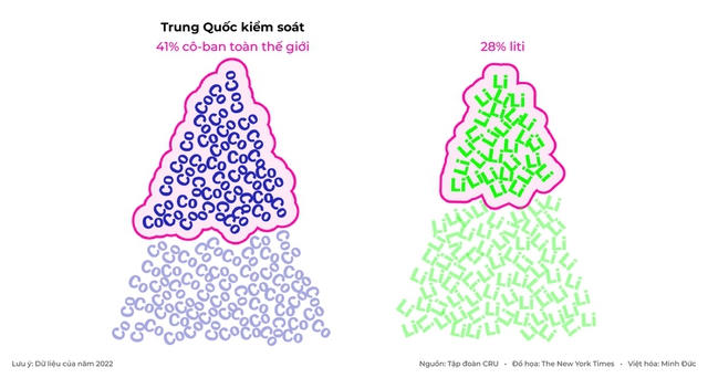 Tờ The New York Times từng có bài viết thể hiện mức độ tham gia của Trung Quốc trong chuỗi cung ứng làm pin xe điện. Với liti, Trung Quốc kiểm soát khoảng 28% khâu thai khác, khoảng 67% với khâu xử lý - tinh chế, 82% với khâu sản xuất dung dịch điện phân, và sản xuất khoảng 66% cell pin toàn thế giới.
