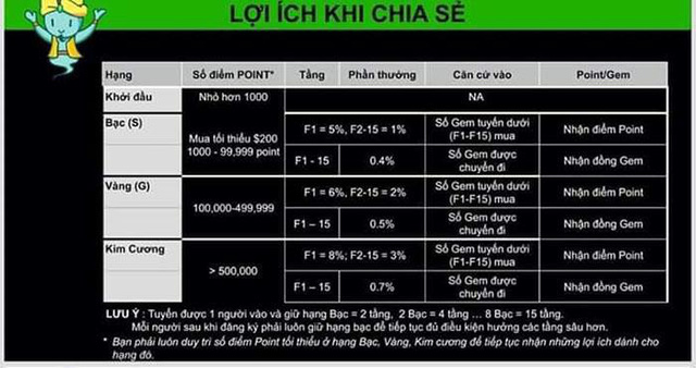 Với chính sách tuyển hệ thống, khoản hoa hồng người tham gia nhận về từ tầng lớp F1, F2,...cũng chỉ là "point" và "gem", hoàn toàn không có tiền thật.