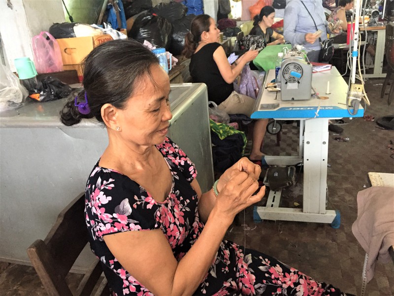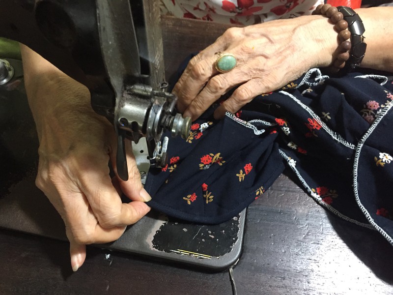 Chiếc bàn may của bà Hiền nằm ở góc cuối cùng bên tay trái lầu may. Chiếc máy may bà sử dụng giờ có lẽ đã thuộc hàng hiếm. Ở lầu may này, chỉ còn đôi người vẫn không chịu “lên đời” cho đầu máy may như bà Hiền. Đã 71 tuổi, bà Hiền “lười” mang kiếng lão, dù mắt đã không còn tinh anh như thuở trước. Vậy nên, cầm sợi chỉ trắng trên tay, bà dí mãi vẫn chưa xuyên được vào lỗ kim.