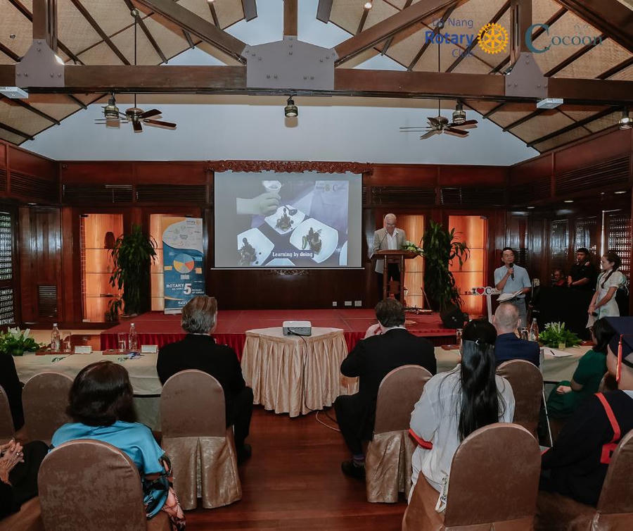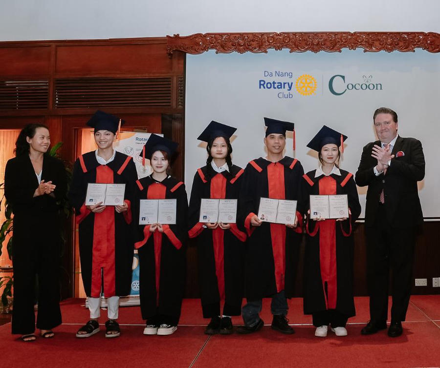 Ông Michael Roberts, Chủ Tịch đương nhiệm của Rotary Đà Nẵng kiêm quản lý dự án Cocoon chia sẻ: “Ngành công nghiệp khách sạn, nghỉ dưỡng đặc biệt yêu cầu tính chuyên cần rất cao, tuy nhiên nó cũng mang lại nhiều cơ hội. Nếu thực sự nỗ lực, từ một nhân viên các bạn có thể trở thành một quản lý chỉ trong thời gian ngắn. Tôi rất tự hào về các bạn tốt nghiệp ngày hôm nay và xin chúc các bạn những điều tốt đẹp nhất trong hành trình tiếp theo của mình.”