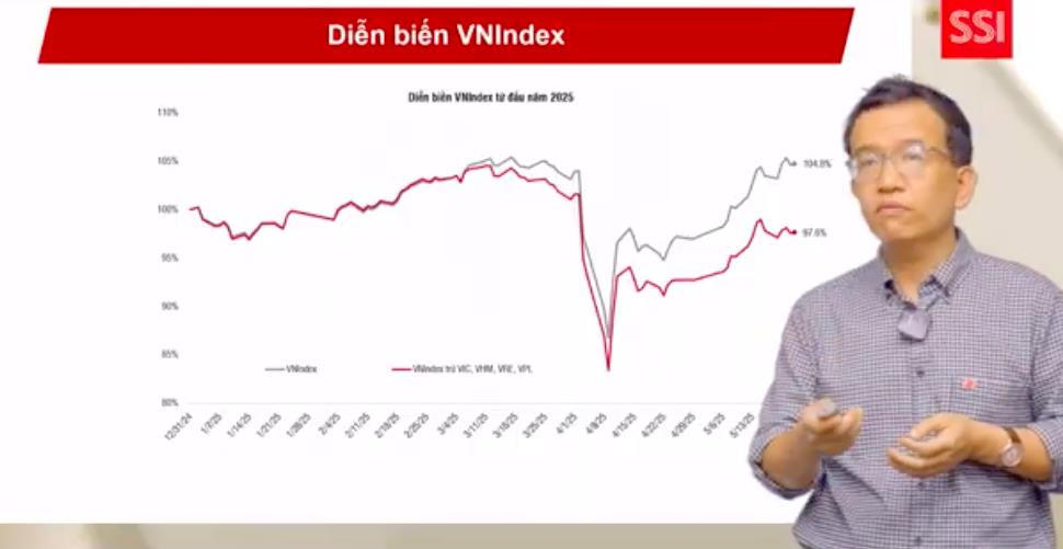 Về thị trường chứng khoán, ông Phạm Lưu Hưng cho biết VN-Index đã gần như lấy lại toàn bộ những gì đã mất khi trở lại vùng giá trước khi ông Trump tuyên bố áp thuế. Động lực chính đến từ nhóm cổ phiếu vốn hóa lớn, đặc biệt là họ Vingroup như VIC, VHM, VRE, VPL…