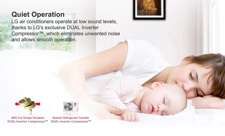 Thông qua ứng dụng LG ThinQ, người dùng có thể bật làm mát hoặc sưởi ấm thông qua công nghệ Máy nén biến tần kép của LG và luồng không khí gián tiếp 3 chiều. Độ ồn của máy ở mức 20dB với cánh quạt ẩn đem tới chế độ ngủ để không làm phiền hoặc làm gián đoạn giấc ngủ của mọi người.