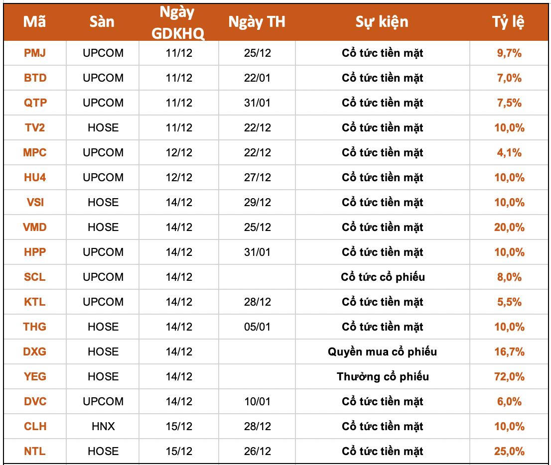 Theo thống kê, có 17 doanh nghiệp thông báo chốt quyền cổ tức trong tuần 11– 15/12. Trong đó, 14 doanh nghiệp trả cổ tức bằng tiền mặt, 1 doanh nghiệp trả cổ tức cổ phiếu, 1 doanh nghiệp thưởng cổ phiếu trong tuần này.