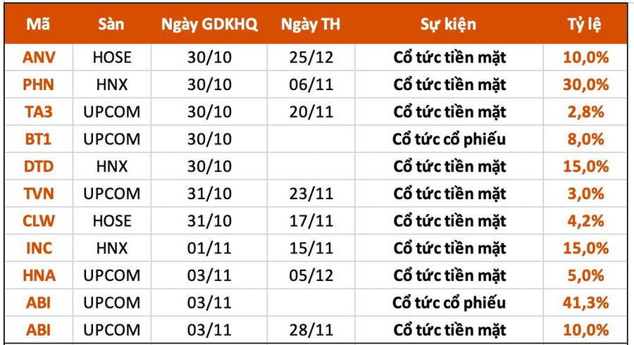 Lịch chốt quyền cổ tức tuần 30/10-3/11: Cổ tức tiền mặt cao nhất 30%