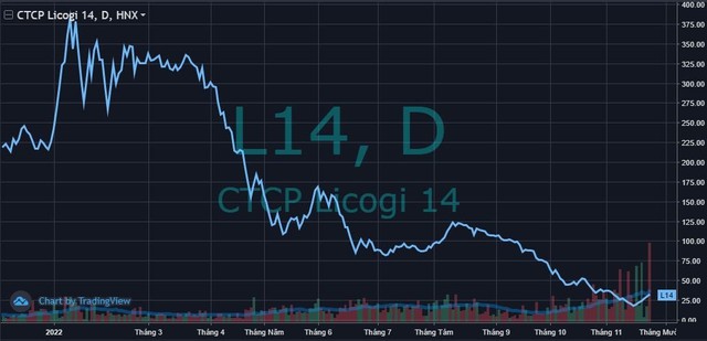 Trên thị trường, sau 5 phiên trần liên tiếp, cổ phiếu L14 vẫn đang tiếp tục tăng mạnh phiên 23/11 và có thời điểm đã chạm trần trước khi tạm kết phiên sáng với mức tăng hơn 9,2%. So với đáy, thị giá L14 đã tăng gần 75% sau vài phiên nhưng vẫn chỉ bằng 1/10 thời điểm đạt đỉnh hồi giữa tháng 1 năm nay.