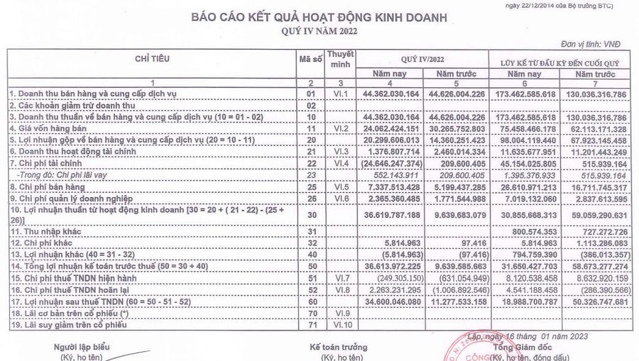 Giá vốn hàng bán giảm 20% so với quý IV/2021, xuống mức 24 tỷ đồng. Trong kỳ, Licogi 14 ghi nhận chi phí tài chính âm 24,6 tỷ đồng, chủ yếu do doanh nghiệp bán và hoàn nhập trích lập dự phòng cho các khoản đầu tư chứng khoán từ quý II và quý III/2022 khi thị trường trở nên thuận lợi hơn. Kết quả là, lợi nhuận sau thuế đạt gần 35 tỷ đồng, gấp 3 lần so với quý IV/2022.