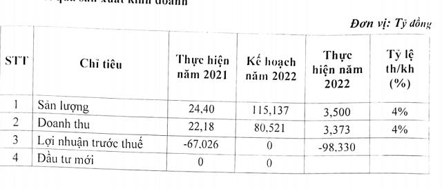 Năm 2022, Công ty chủ yếu giải quyết các việc tồn đọng, làm việc với ngân hàng, thu hồi công nợ. Kết quả thực hiện năm 2022 cụ thể đạt doanh thu gần 3,4 tỷ đồng và lỗ trước thuế hơn 98 tỷ đồng, tăng mạnh hơn so với mức lỗ hơn 67 tỷ đồng ở năm 2021.
