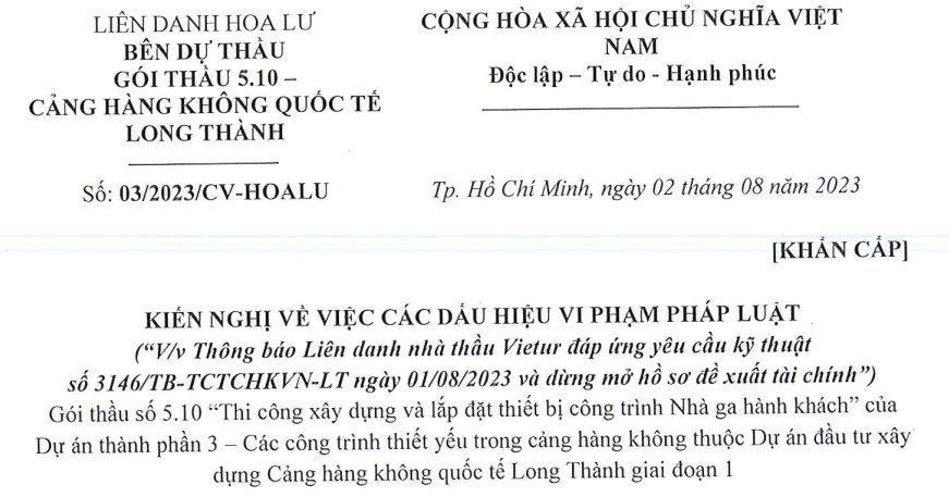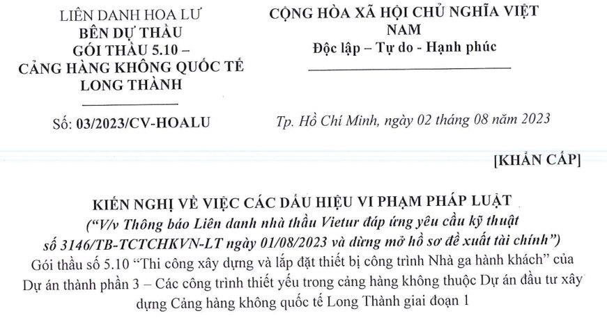 Liên danh Hoa Lư vừa gửi đơn Kiến nghị với tư cách là bên dự thầu gói thầu 5.10 – Cảng Hàng không Quốc tế Long Thành để khiếu nại Tổng công ty Cảng hàng không Việt Nam (ACV) liên quan đến Thông báo Liên danh nhà thầu Vietur đáp ứng yêu cầu kỹ thuật số 3146/TB-TCTHKVN-LT ngày 1/8/2023.
