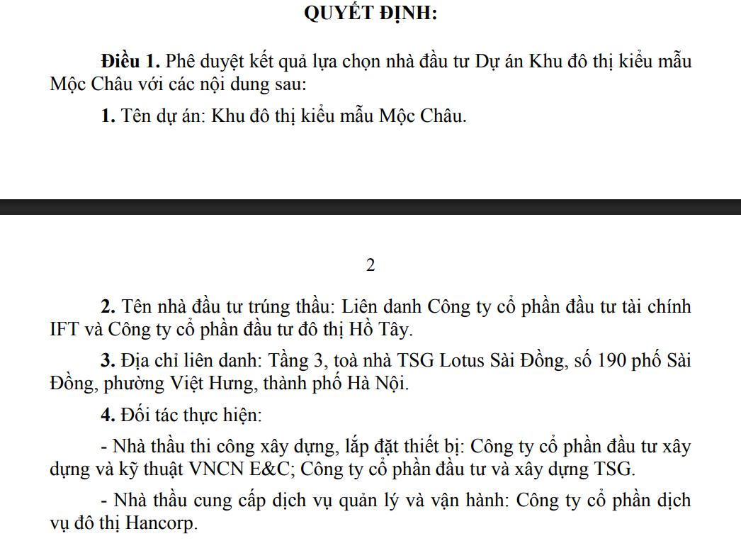 Theo quyết định, liên danh CTCP Đầu tư Tài chính IFT và CTCP Đầu tư Đô thị Hồ Tây là nhà đầu tư trúng thầu thực hiện dự án (trụ sở của liên danh tại tầng 3, tòa nhà TSG Lotus Sài Đồng, số 190 phố Sài Đồng, phường Việt Hưng, TP Hà Nội).