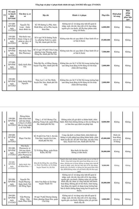 Mới đây, Sở Y tế Hà Nội đã tiến hành công khai danh sách xử phạt vi phạm hành chính với các cơ sở trên địa bàn. Theo danh sách này, từ ngày 24/4/2023 đến ngày 27/4/2023 Thanh tra Sở Y tế Hà Nội đã kiểm tra, xử phạt hành chính 22 cơ sở kinh doanh dược; cơ sở khám, chữa bệnh trên địa bàn thành phố Hà Nội. Tổng số tiền mà đơn vị này xử phạt các đơn vị là hơn 315 triệu đồng.