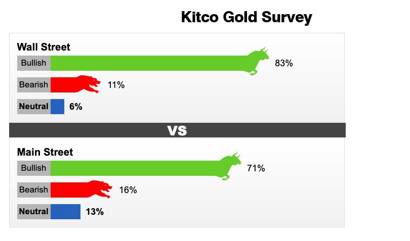 Tâm lý lạc quan về giá vàng cũng tương tự ở các nhà đầu tư Phố Main, trong số 1.018 phiếu bầu được bỏ ra tại cuộc thăm dò trực tuyến, có 722 người (tương đương 71%) tin tưởng giá kim loại quý chinh phục mức giá mới trong tuần tới; chỉ có 165 người (tương đương 16%) cho rằng vàng sẽ giảm giá, trong khi 131 người khác (13%) nghĩ giá vàng sẽ đi ngang.
