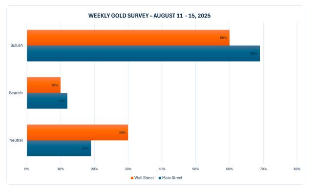 Trong khi đó, các nhà giao dịch bán lẻ vẫn duy trì xu hướng tăng giá mới của họ đối với triển vọng ngắn hạn của vàng. Với 10 nhà phân tích tham gia, có 6 người (60%) dự báo giá sẽ tăng trong tuần tới, chỉ 1 người (10%) dự báo giảm, và 3 người (30%) cho rằng giá sẽ đi ngang.